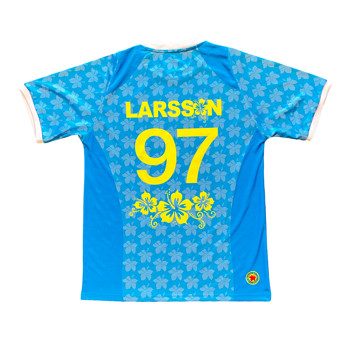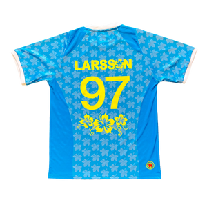 Custom blue jersey with an allover floral print featuring Midnight Sun on the front and LARSSON 97 design on the back.